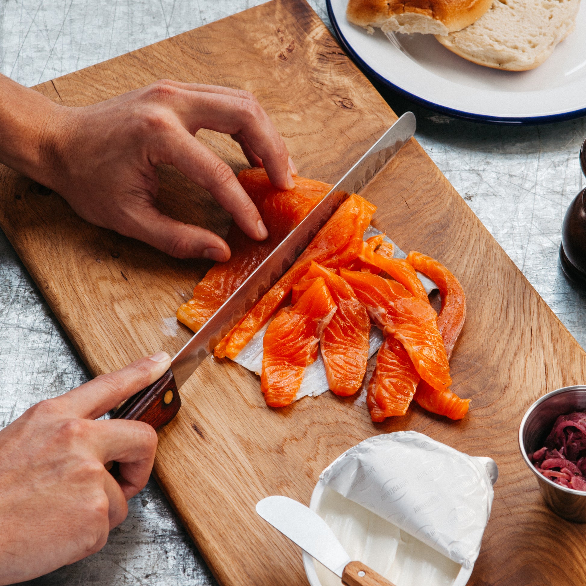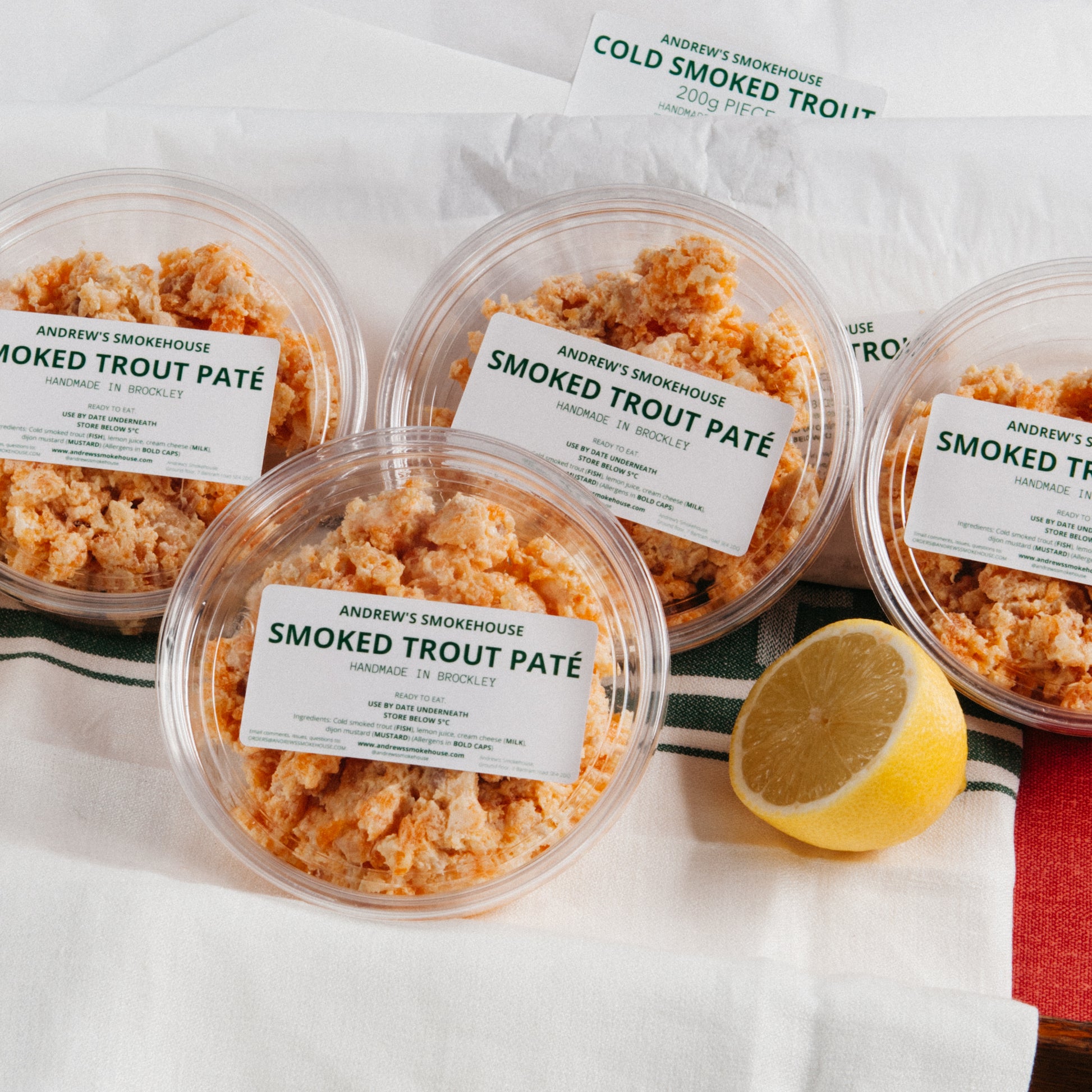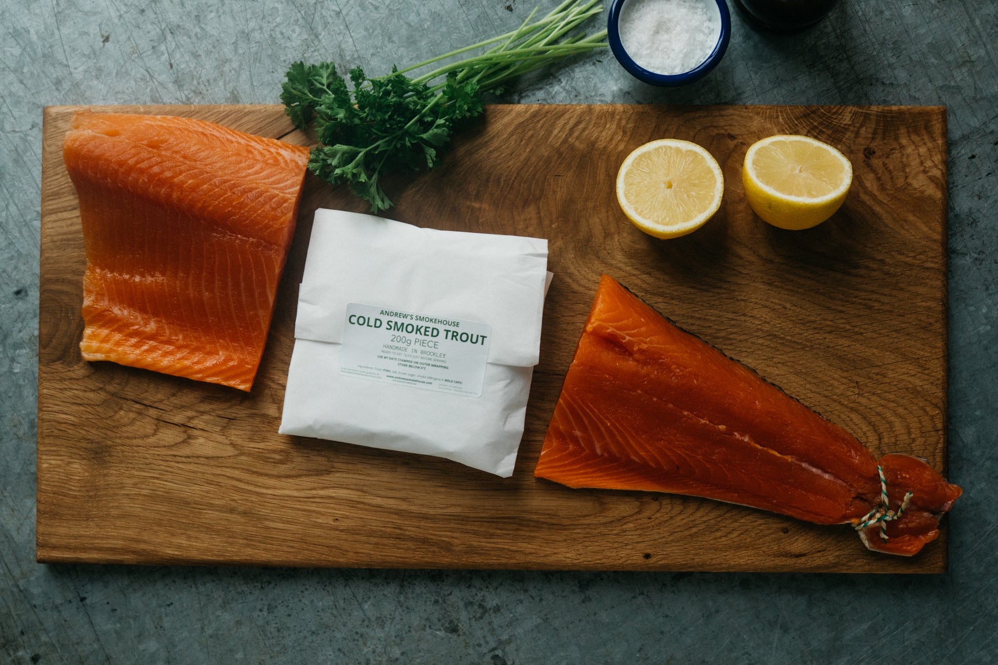 40g of smoked trout per person is a good rule of thumb for a starter sized portion. Remember you slice yourself so you can tailor how you use every last gram.
